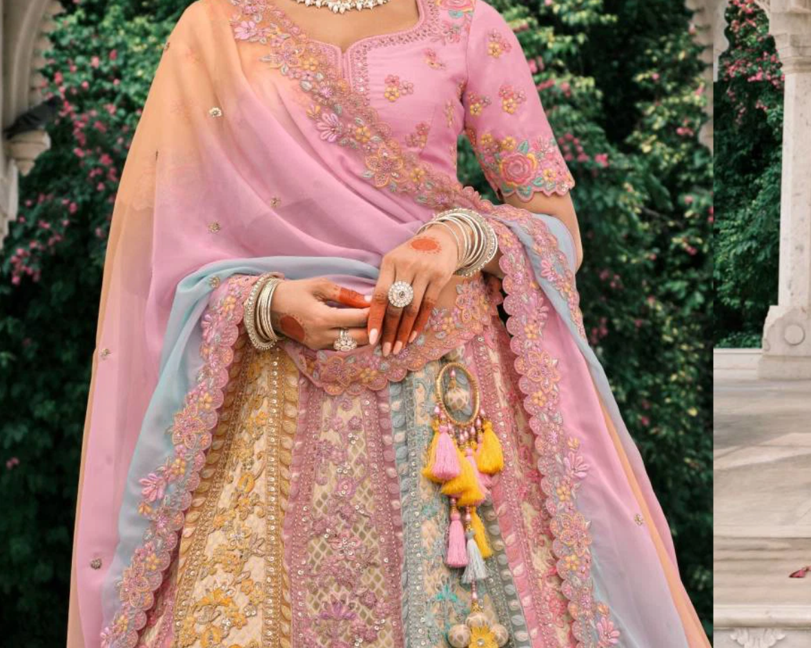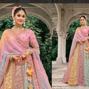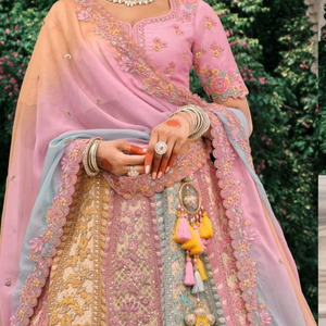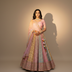 Elevate your festive and wedding wardrobe with this exquisite pastel multicolour lehenga choli set. Crafted in luxurious silk fabric, the lehenga features intricate zari and thread embroidery arranged in elegant panelled patterns, blending soft hues of blush pink, powder blue, mint green, and antique gold.