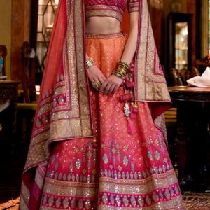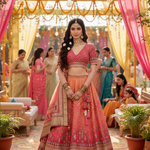Elevate your ethnic wardrobe with this stunning Rani pink and coral orange Rajwadi silk lehenga choli set, designed for grand festive and wedding occasions.
