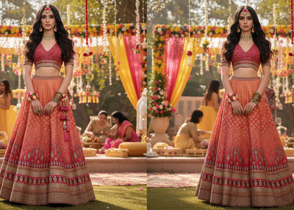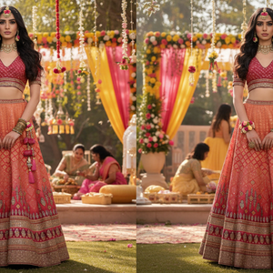 The lehenga is crafted from smooth Rajwadi silk, beautifully enhanced with sparkle and mirror work, offering a rich traditional appeal with a modern festive touch. It features a ready size 36 waist with an additional 4-inch margin, ensuring comfort and easy alterations, along with a flared 4.5-meter ghera for a graceful silhouette.