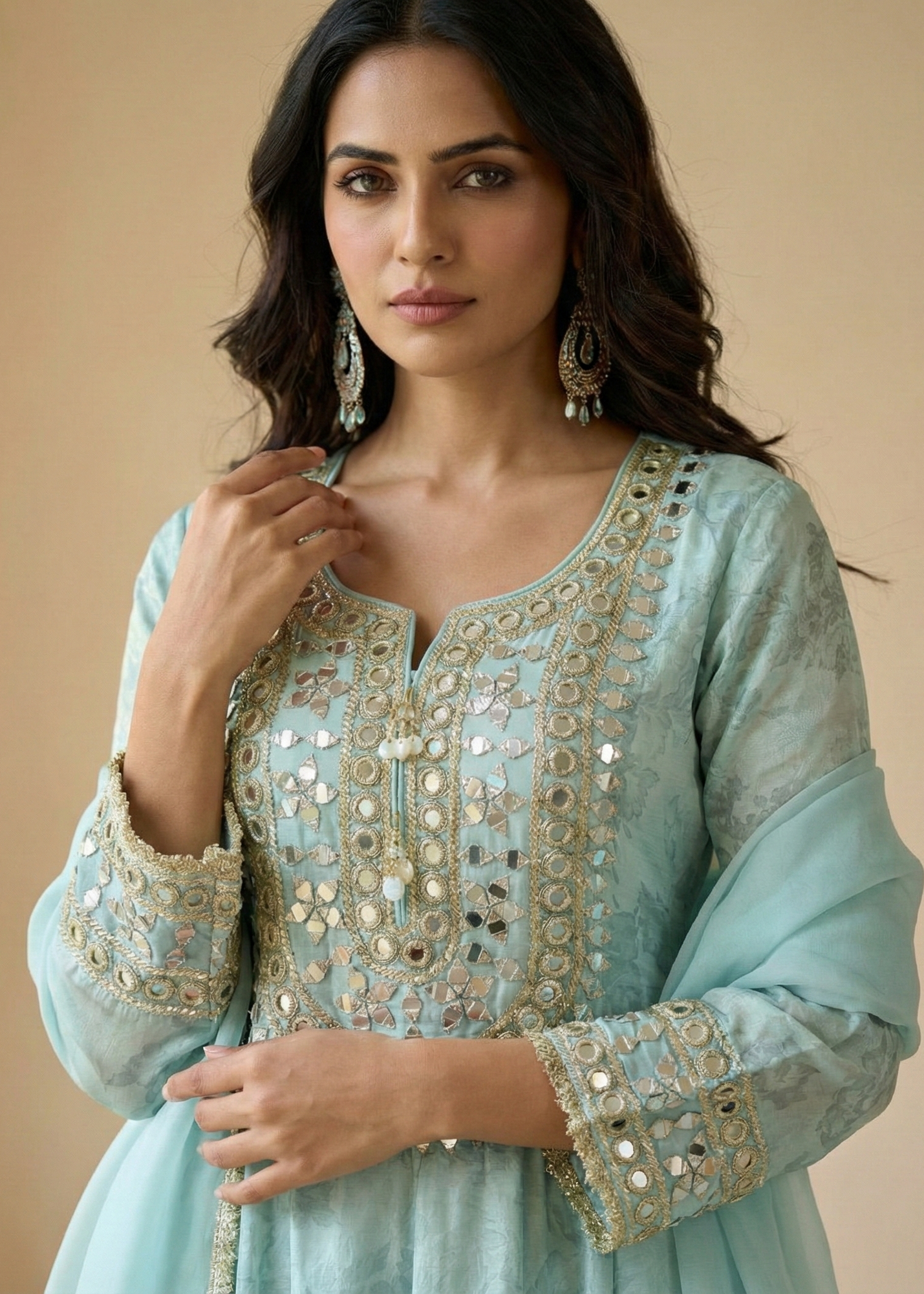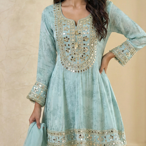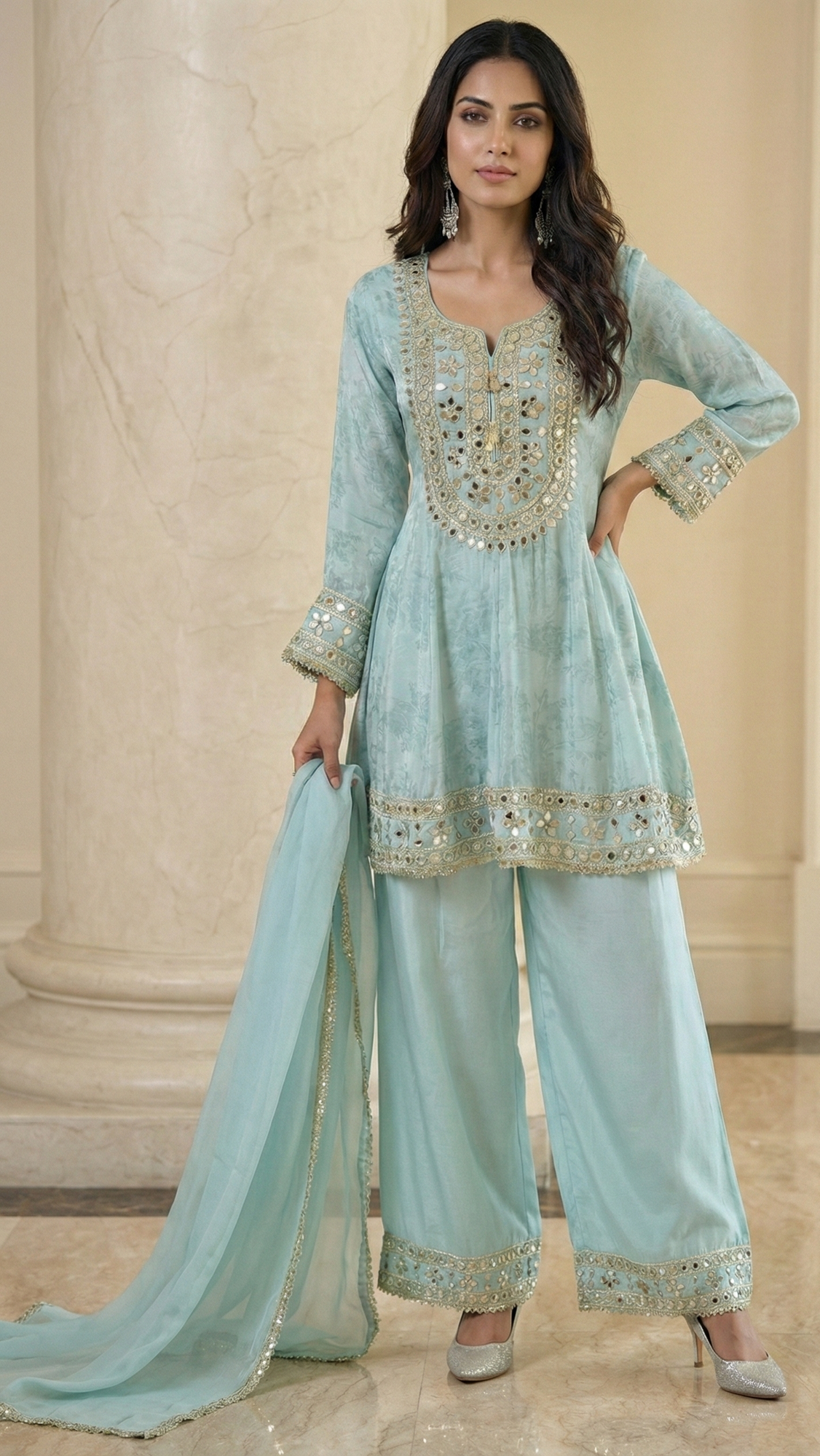 Aqua Luxe – Premium Mirror Work Silk Suit Set with Palazzo & Dupatta