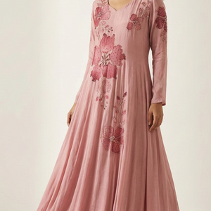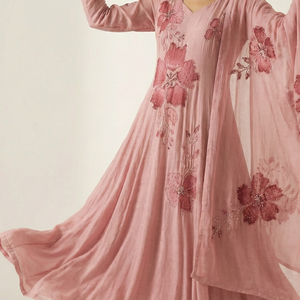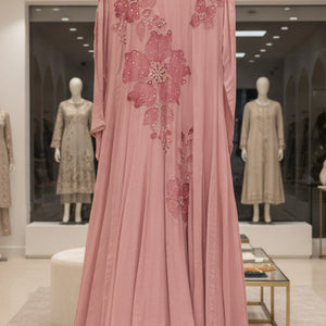 Blush Pink Chinnon Brush-Painted Floor-Length Gown Set with Handwork
