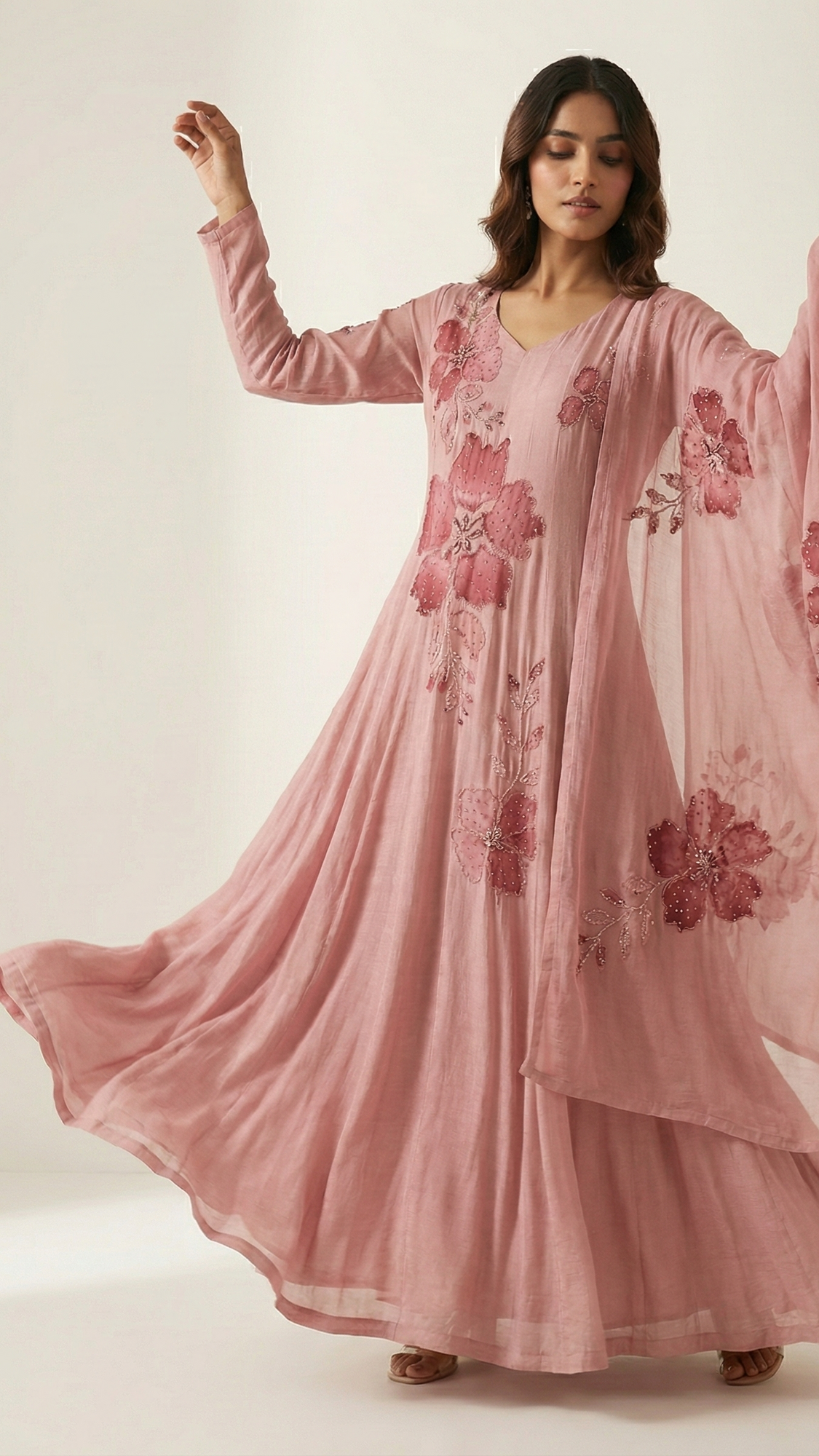 Step into effortless elegance with this Chinnon Floor-Length Gown Set, designed to make a soft yet striking statement. The gown features artistic brush-paint detailing, enhanced with delicate hand embroidery and subtle embellishments that add depth and refinement without overpowering the look.