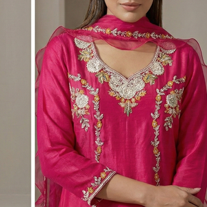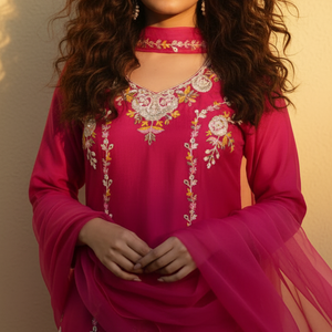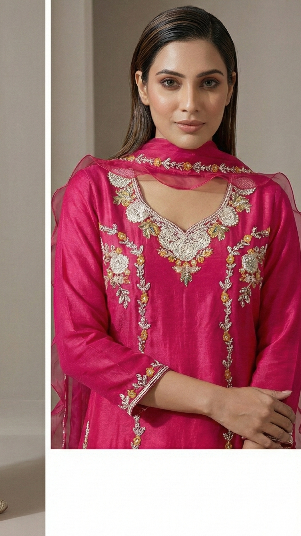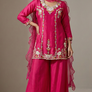 Make a bold yet elegant statement with this Fuchsia Bloom Indo-Western Straight Suit Set, crafted in luxurious Chinon silk and elevated with intricate embroidery detailing. The straight-cut kurta features refined handwork that beautifully complements the flowy palazzo pants, while the organza ruffle dupatta adds a touch of contemporary drama and softness.