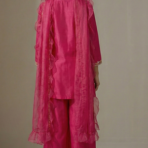 Fuchsia Bloom Chinon Silk Straight Suit Set with Organza Ruffle Dupatta