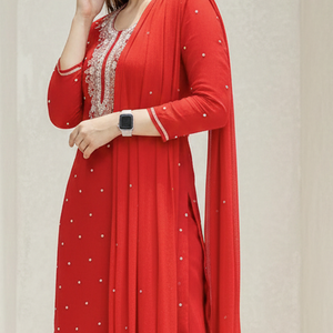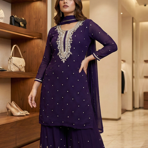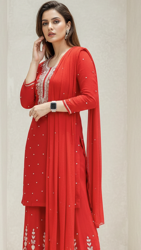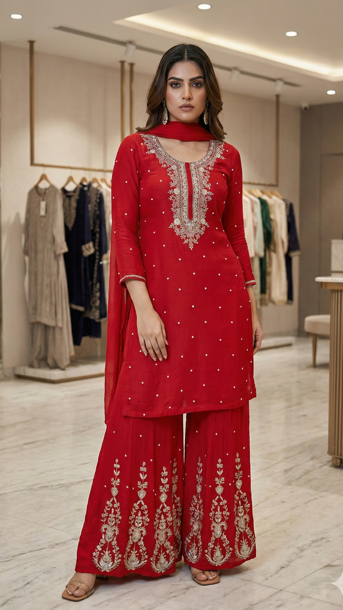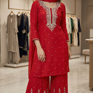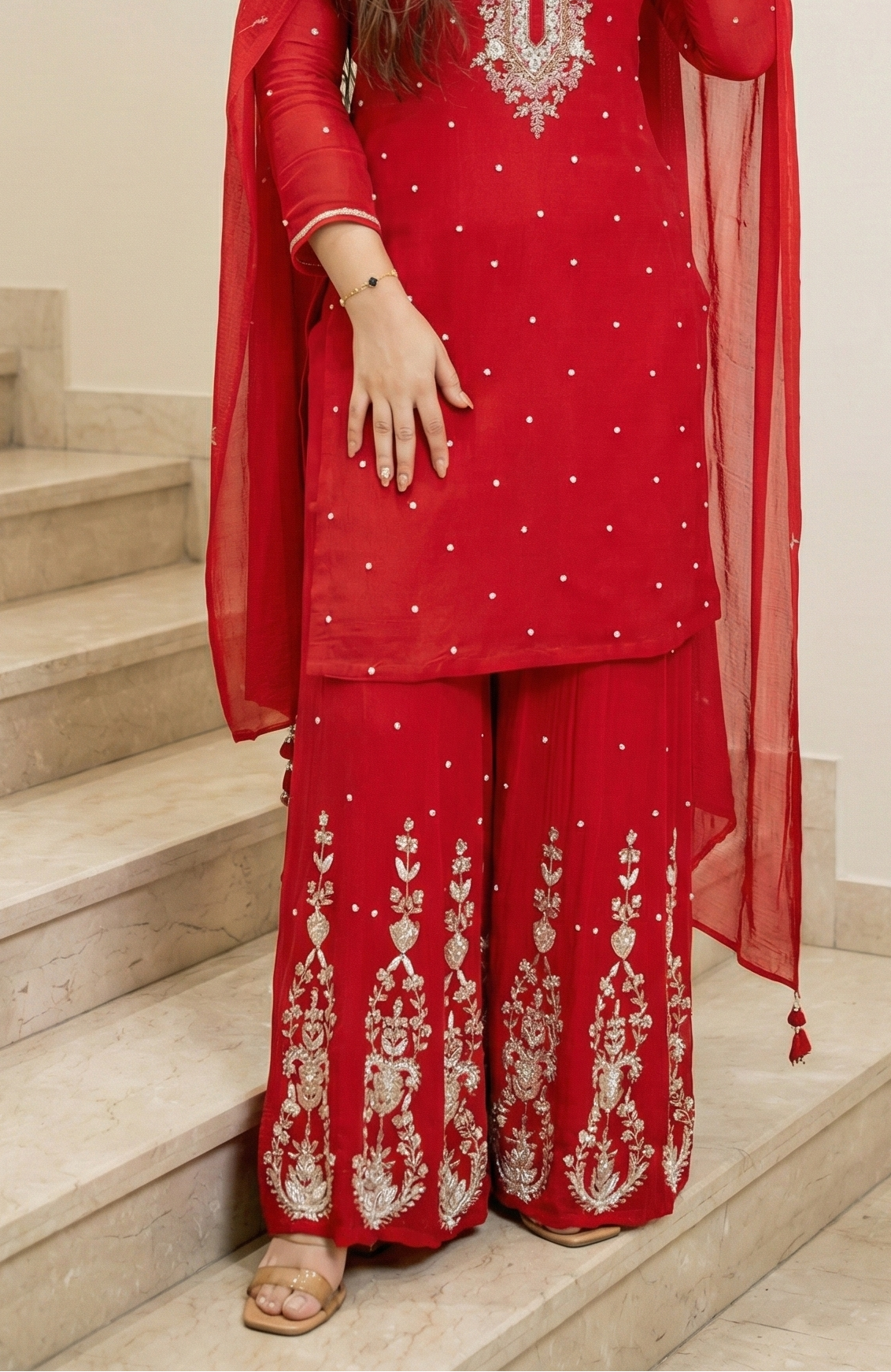 Make a graceful statement at festive and special occasions with this elegant Georgette Handwork Kurta Sharara Set. Crafted from premium georgette fabric, the ensemble offers a soft, lightweight feel with a beautiful fluid drape that enhances comfort and movement.
