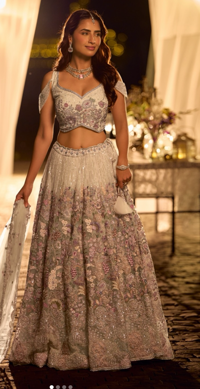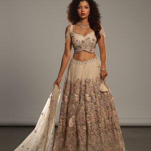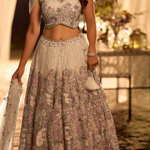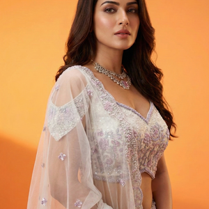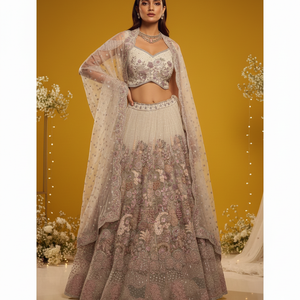 Step into timeless elegance with this exquisite ivory pearl net designer lehenga choli, crafted for luxurious wedding and evening celebrations.