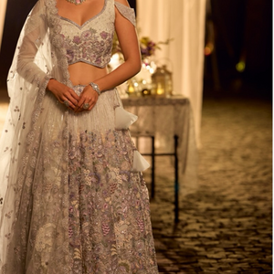 The lehenga is beautifully designed in fine net fabric, adorned with intricate embroidery and mirror work, enhanced with delicate pastel thread detailing for a soft, romantic appeal. The matching blouse features elegant embroidery that complements the lehenga’s ornate craftsmanship, while the sheer net dupatta adds a graceful and ethereal finish to the ensemble.