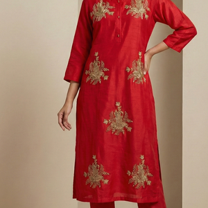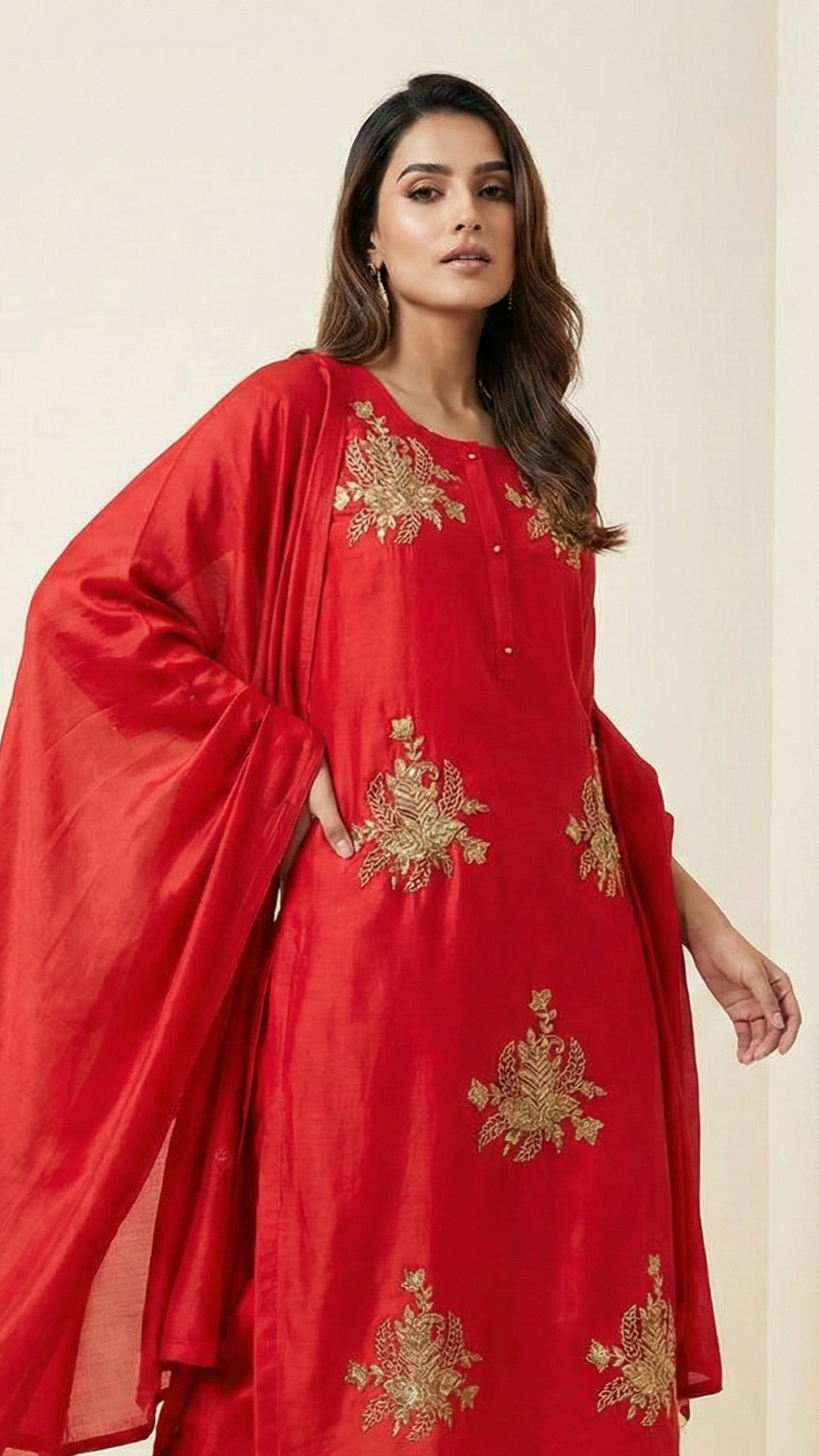 beautifully enhanced with elegant handwork embroidery motifs. The kurta features traditional floral-inspired handwork placed gracefully all over, giving it a luxury ethnic look that feels light yet premium.