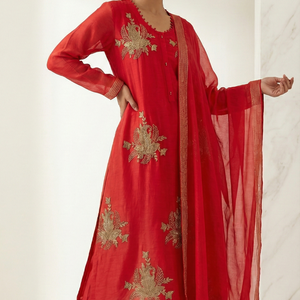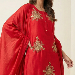 Red Pure Mulchanderi Handwork Suit Set with Matching Pants & Dupatta