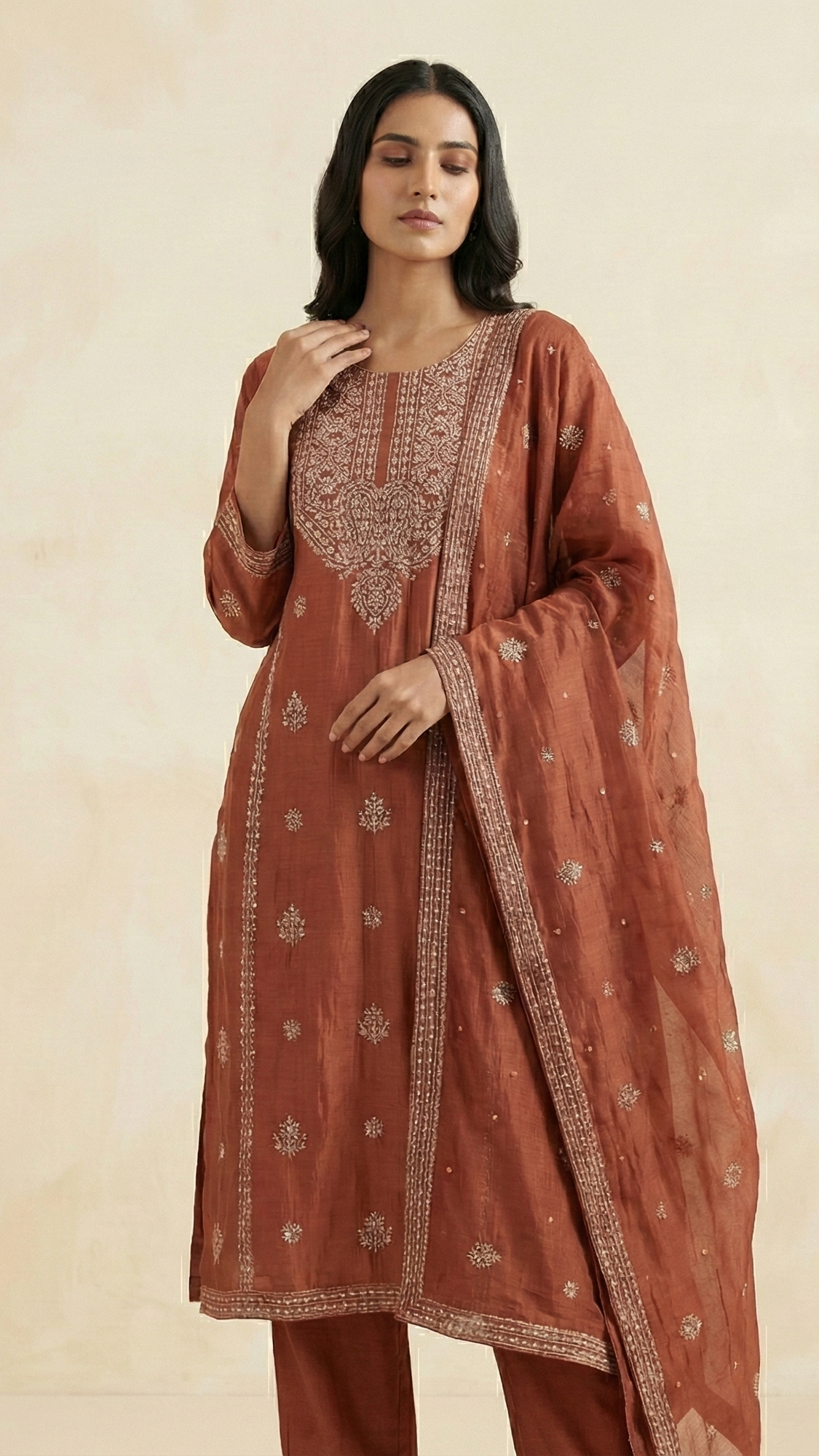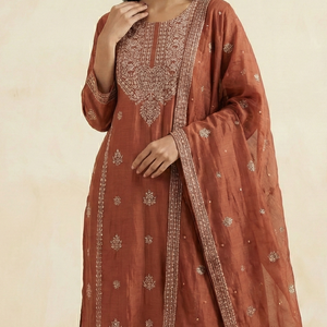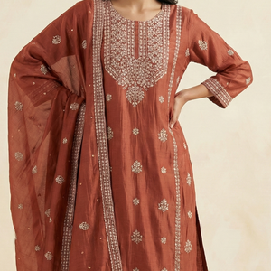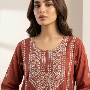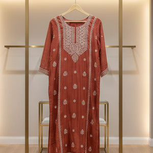 Rust Brown Pure Mulchanderi Chikankari Straight Suit