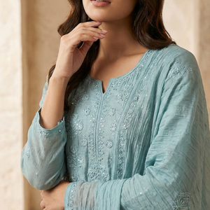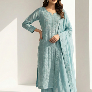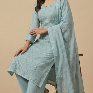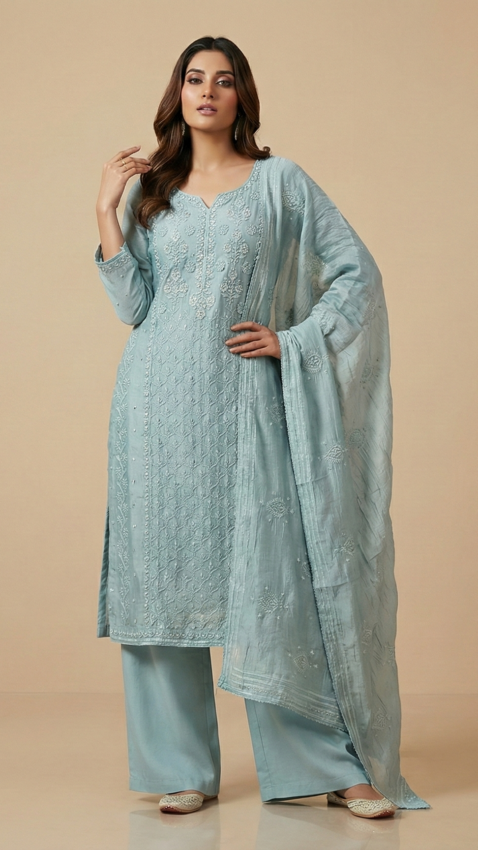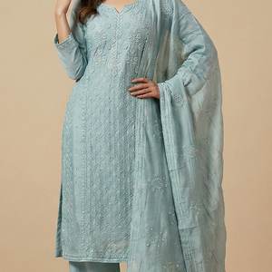 Refresh your ethnic wardrobe with this Pure Mulchanderi Chikankari Suit Set, crafted in a soothing sky blue tone for a graceful and premium look. Featuring elegant all-over chikankari embroidery, this straight-fit kurta comes paired with same-colour matching pants for a complete luxury style outfit. Perfect for festive occasions, casual gatherings, and elegant day wear.