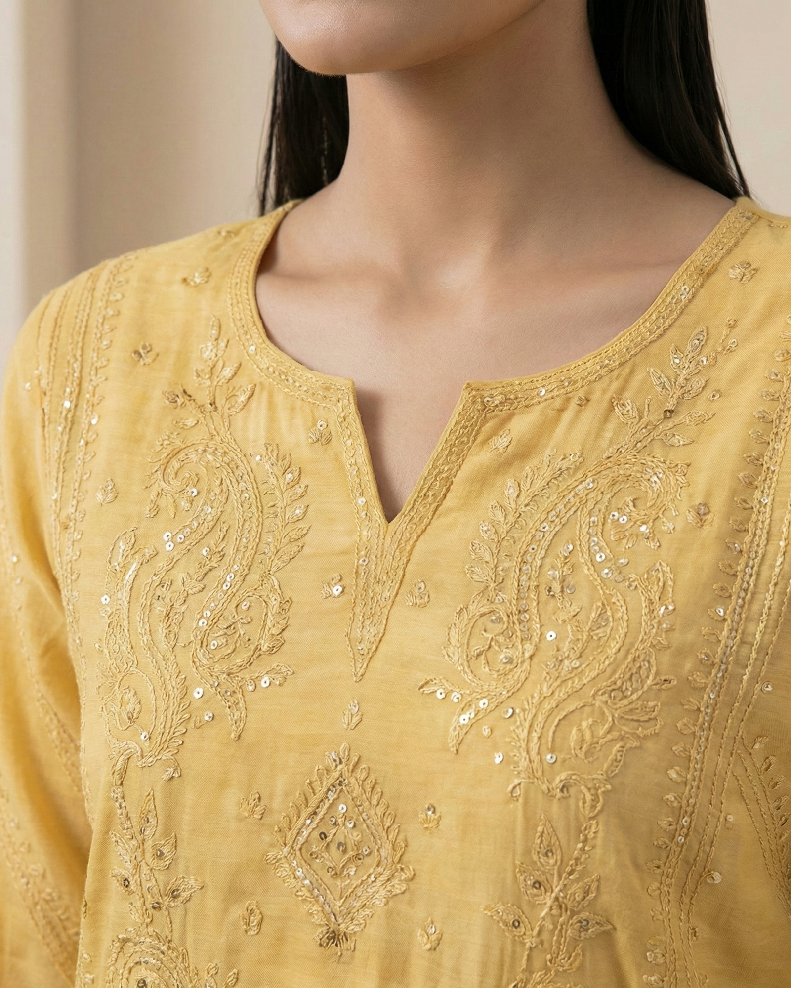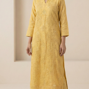 Grace meets tradition in this exquisite Mul Chanderi suit set, delicately adorned with intricate chikankari embroidery and fine handwork. The soft, breathable fabric lends an effortless flow, while the subtle craftsmanship adds timeless elegance. Paired with a matching sheer dupatta featuring coordinated embroidery, this suit is perfect for daytime festivities, festive gatherings, and elegant soirées. A refined choice for women who appreciate understated luxury and classic Indian craftsmanship.