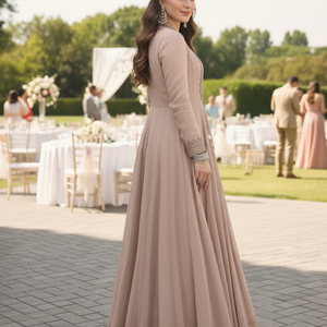 Elevate your wedding and festive style with this elegant champagne beige premium stylist gown set, designed for a luxurious and graceful appearance.