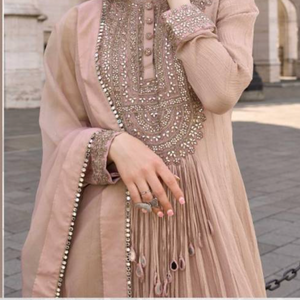 Paired with a premium real Chinon silk dupatta, this ensemble offers a soft drape and sophisticated finish. Designed in a free-size stitched fit, the gown ensures comfort, ease of wear, and a flattering fall.