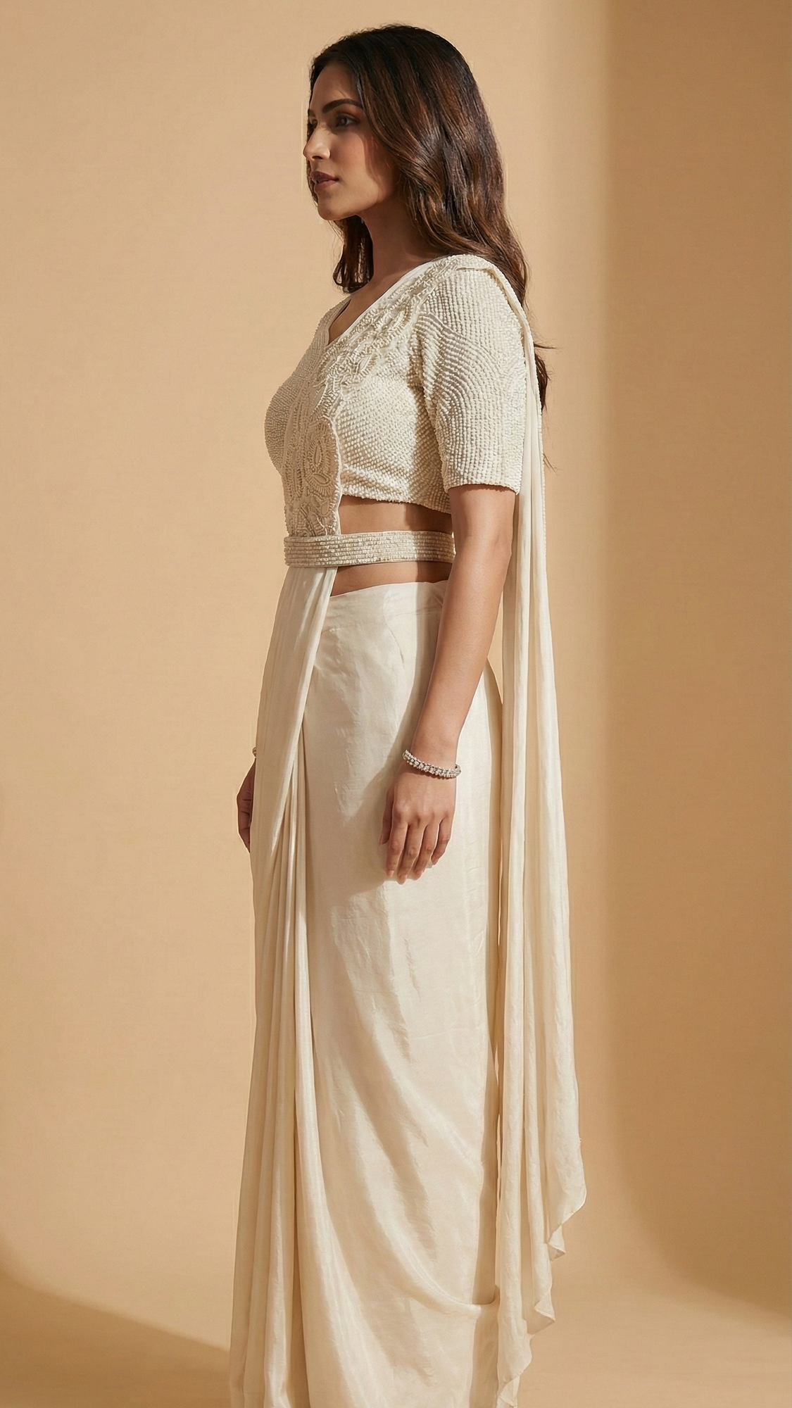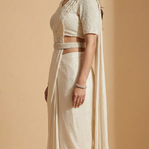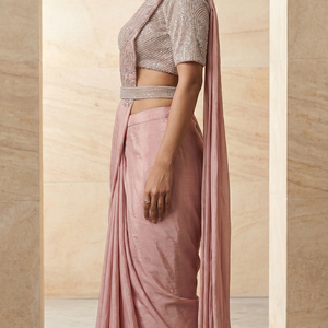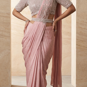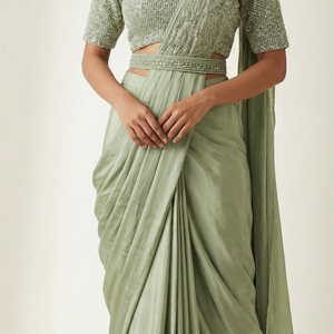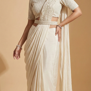 Elevate your ethnic wardrobe with this exquisitely crafted ready-to-wear saree made from luxurious Chinon Silk. Designed for modern elegance and effortless draping, this saree features a beautifully embroidered blouse paired with a soft, flowy pre-stitched saree silhouette that ensures comfort and sophistication.