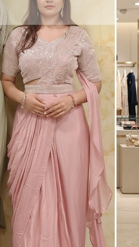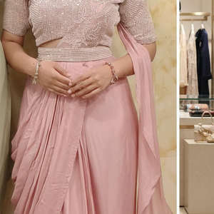 The fine sheen of Chinon silk enhances the graceful fall of the saree, making it perfect for festive celebrations, cocktail evenings, weddings, and special occasions. Its contemporary styling blends traditional charm with modern ease, allowing you to look stunning without the hassle of traditional draping.