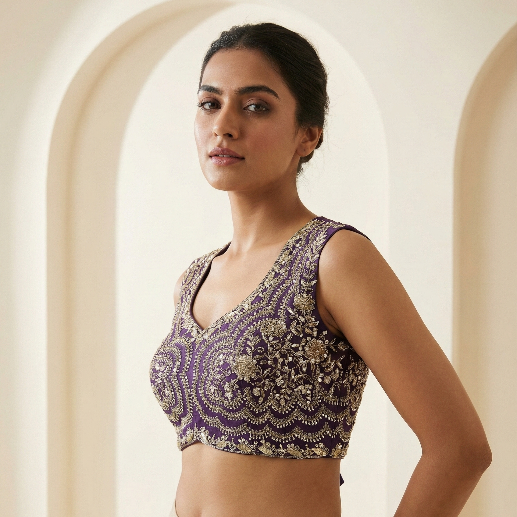 The look is completed with a heavily hand-embroidered blouse, featuring intricate craftsmanship that adds richness and depth to the ensemble. Perfect for weddings, festive occasions, cocktail evenings, and receptions, this saree reflects a seamless blend of tradition and contemporary design.