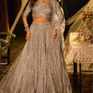 Make a bold statement of luxury with this stunning platinum silver net designer lehenga choli, crafted for glamorous wedding and evening occasions.