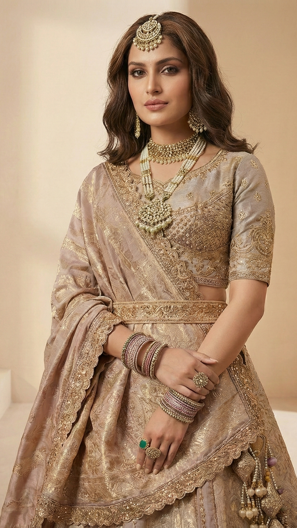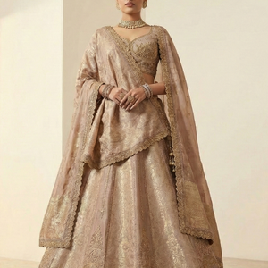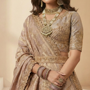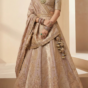 Make a timeless bridal statement with this exquisite Banarasi premium silk lehenga set, designed for grandeur and elegance. The lehenga showcases intricate embroidery with sequence, Swarovski stone embellishments, and zari khatli weaving, creating a rich heritage look with a royal finish.
