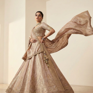 Paired with a heavily embroidered zari silk blouse and a Banarasi woven dupatta detailed with embroidered lace work, this ensemble is perfect for weddings, receptions, and grand festive occasions. The matching embroidered belt adds a contemporary Indo-Western touch while enhancing the silhouette.
