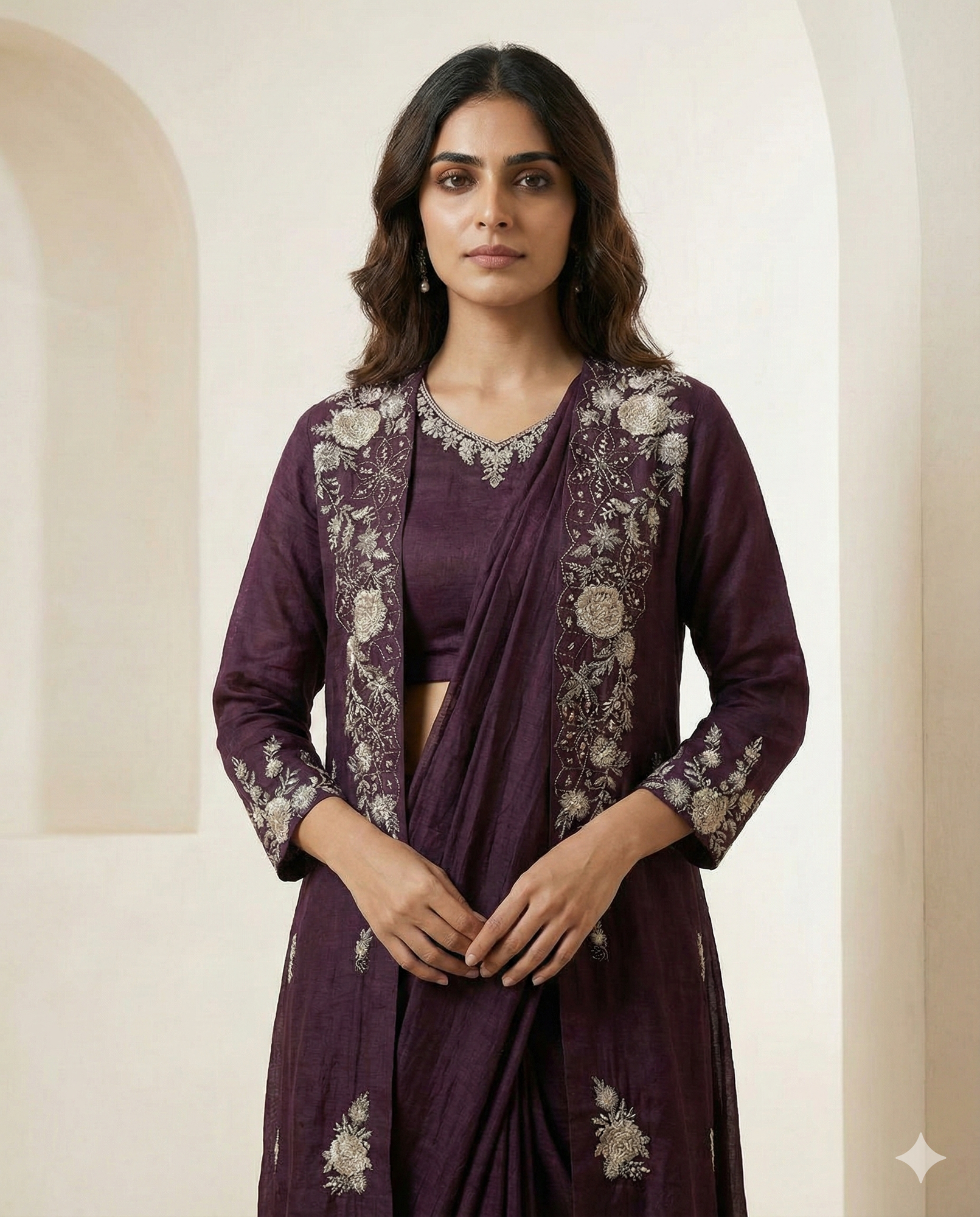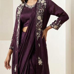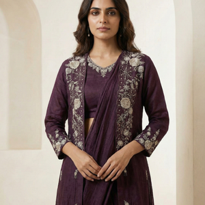 Wine Plum Indo-Western Chinnon Silk Saree Set with Embroidered Jacket