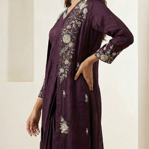 The intricate embroidery along the jacket panels and sleeves enhances the rich base tone, while the lightweight Chinnon silk drapes effortlessly, offering both comfort and grace. Ideal for festive occasions, cocktail evenings, wedding functions, and elegant gatherings, this outfit blends traditional charm with modern styling.