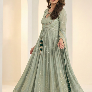 The flowy flare enhances its festive charm, while delicate detailing and fine threadwork add a luxurious touch. Paired with a matching embroidered georgette dupatta, this ensemble creates a complete statement look perfect for weddings, receptions, engagement ceremonies, festive gatherings, and special occasions.