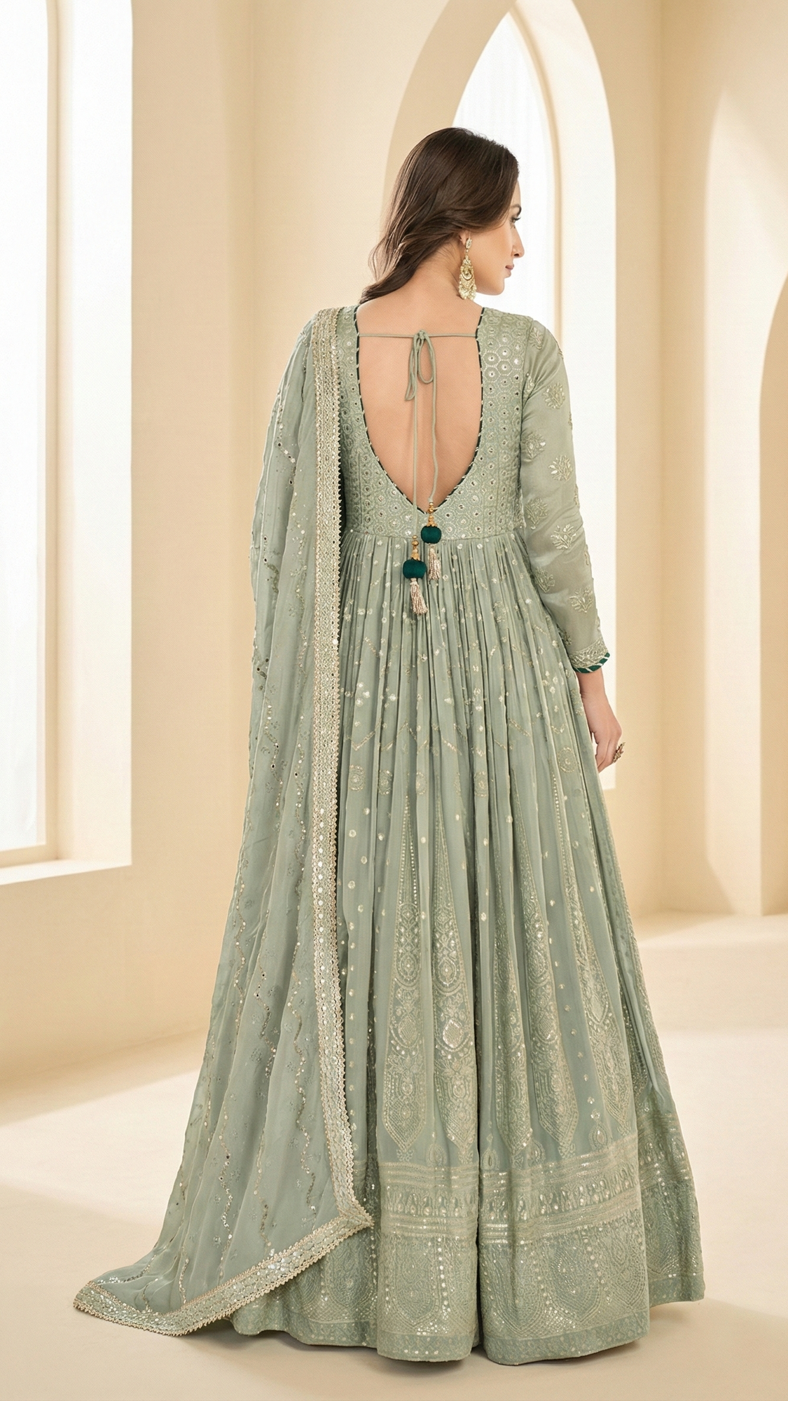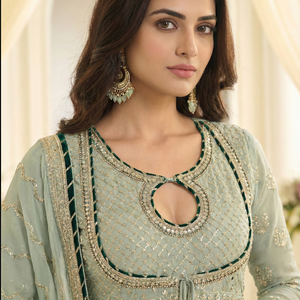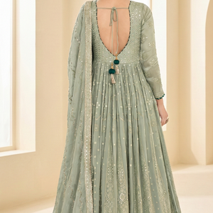 Step into timeless elegance with this stunning Premium Real Georgette festive gown, beautifully crafted with intricate Lucknowi Chikankari embroidery on both front and back. Designed for grand celebrations, this fully heavy embroidered gown exudes grace, royalty, and refined craftsmanship.