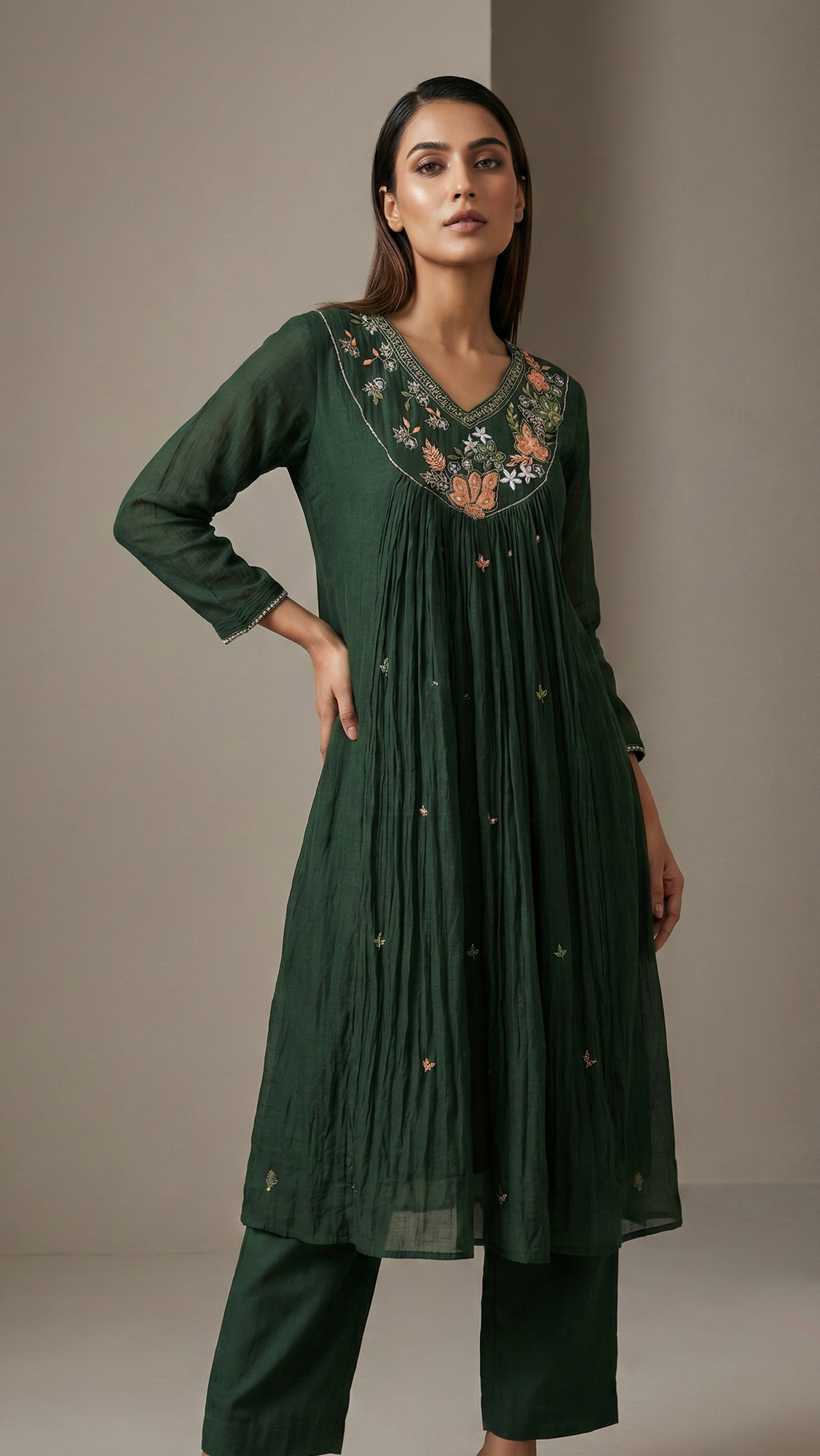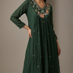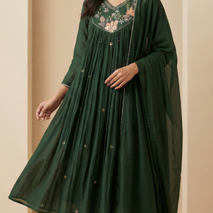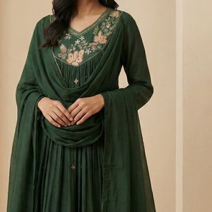 Add timeless elegance to your wardrobe with this Pure Mulchanderi Suit Set in a rich bottle green shade, beautifully enhanced with delicate handwork detailing for a premium festive look.