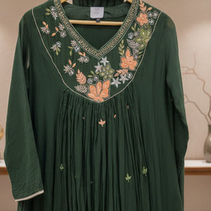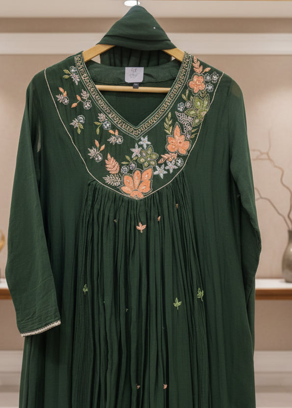 Bottle Green Pure Mulchanderi Suit Set with Handwork | Dupatta & Pants