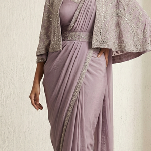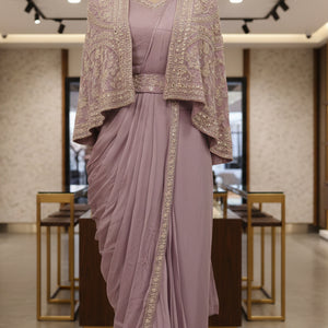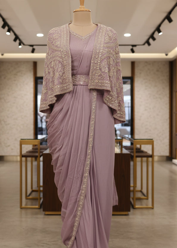 Dusty Mauve Chinnon Saree with Embroidered Cape-Style Blouse