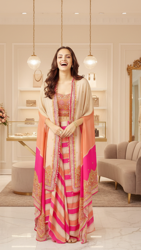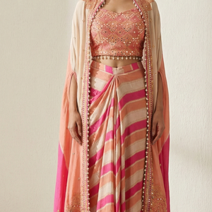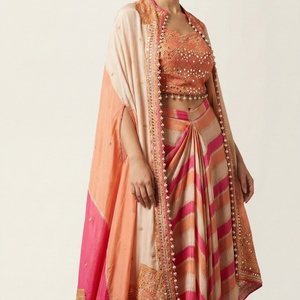 The outfit features a beautifully embroidered crop top, paired with a flowy flared skirt showcasing vibrant striped patterns. Completing the look is a sheer designer cape, adorned with rich borders and intricate embellishment detailing that adds movement and sophistication. Lightweight, airy, and effortlessly stylish, this set is ideal for weddings, festive celebrations, cocktail parties, and destination events.